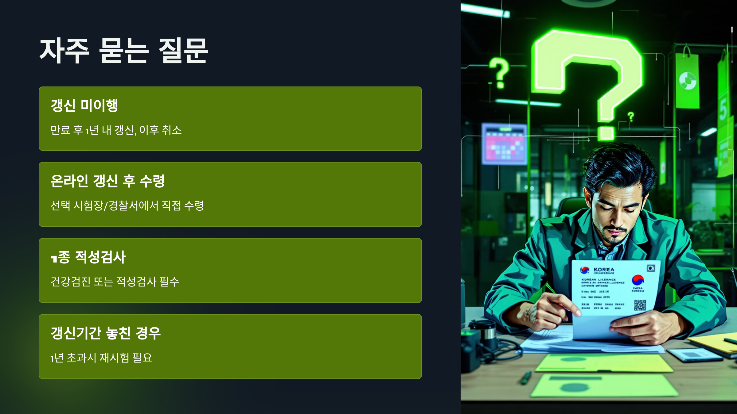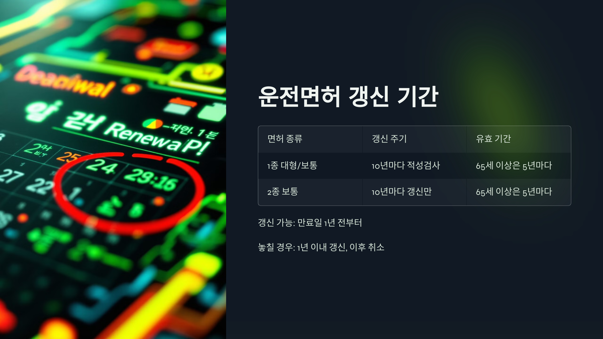 ✅ 면허 갱신을 놓칠 경우: 만료일로부터 1년 이내에는 갱신 가능하지만, 1년이 지나면 면허가 취소되므로 반드시 갱신해야 합니다.